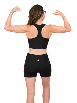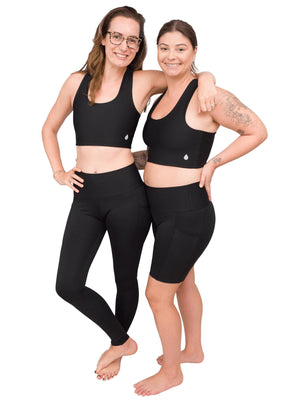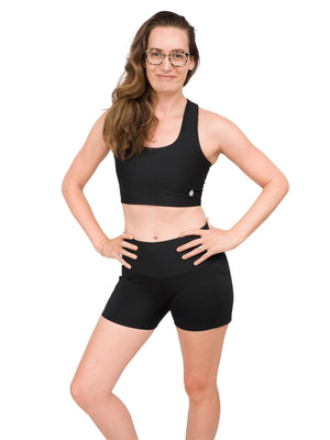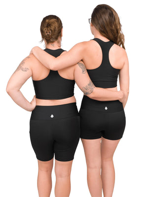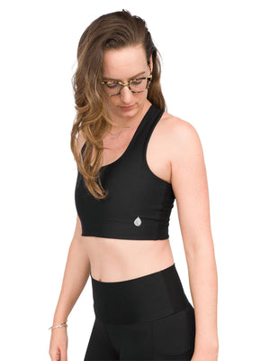 A racerback crop top with a seamless, reversible design and mid-level support. Versatile and multifunctional for use as a swim top, yoga top, workout sports bra, water sports top, or just for all-day comfort.