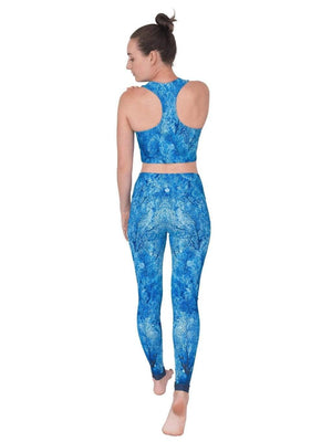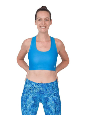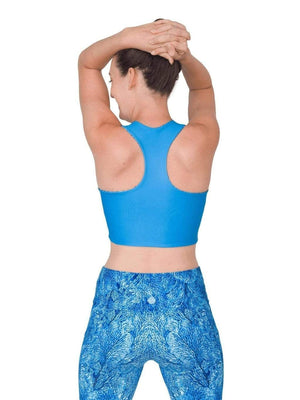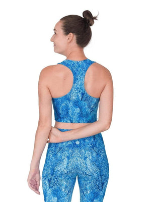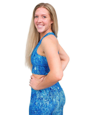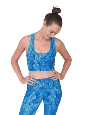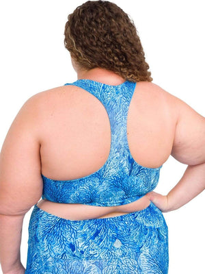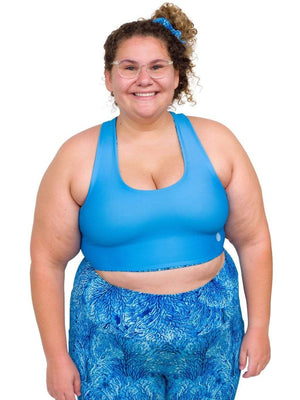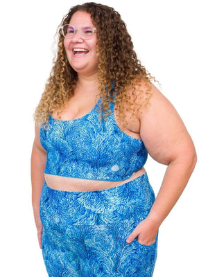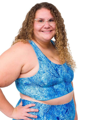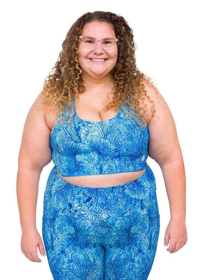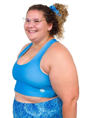 Great top! A bought a size M, I’m a 12b and it fits perfectly, holding everything in place. I love the versatility of this top. It’s thick, well made and today I wore it with my whale shark leggings on the blue side, and it looked great. To make it like a bikini top, because I swim after I hike, cinch the middle with the matching headband, turn up the bottom and you have a bikini top! Please, please make a bikini bottom, it’s the prettiest fabric in your line.