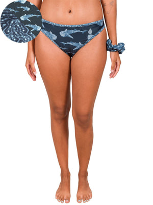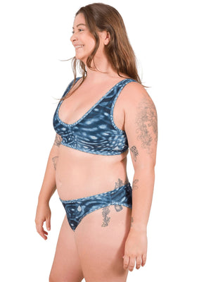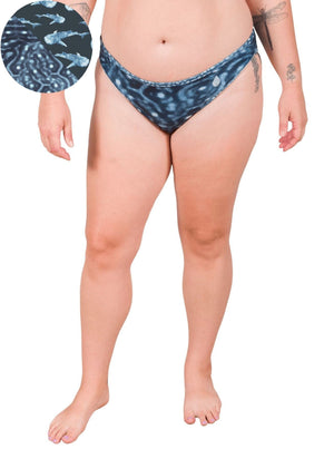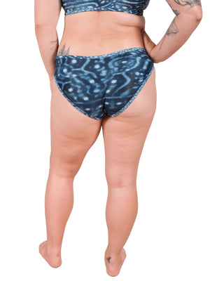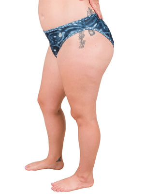 I was trying to decide between the classic bikini and high waisted bikini. The classic bikini is definitely a smaller cut in the bottom than I usually wear but the fabric is such that it stays in place. Not too much is showing from the rear. True to size. Pattern is beautiful. Another fantastic product from Waterlust.