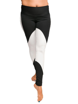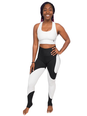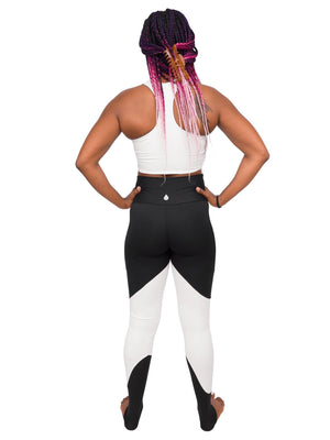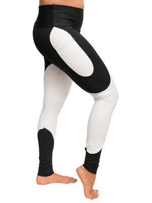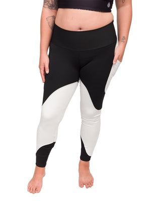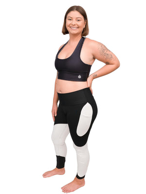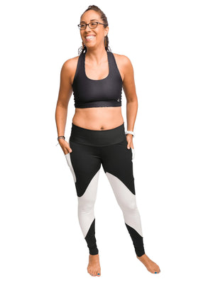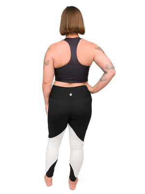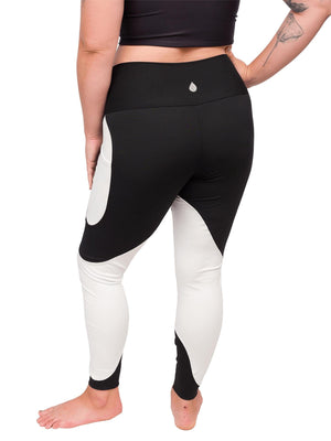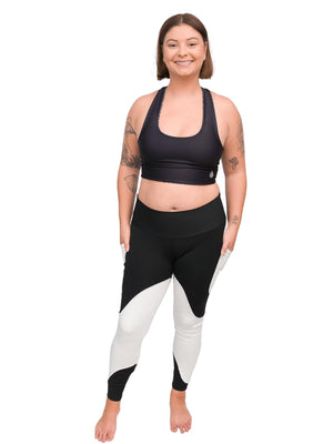 • Made from two variations of our signature fabric. The white fabric is what we use for all our other leggings, as a base that we typically print on. The black fabric is the same but with one difference - it's made from not only recycled plastic bottles but also old clothing! Leggings and other items are recycled once more and given a 3rd (or more!) life, then dyed black.