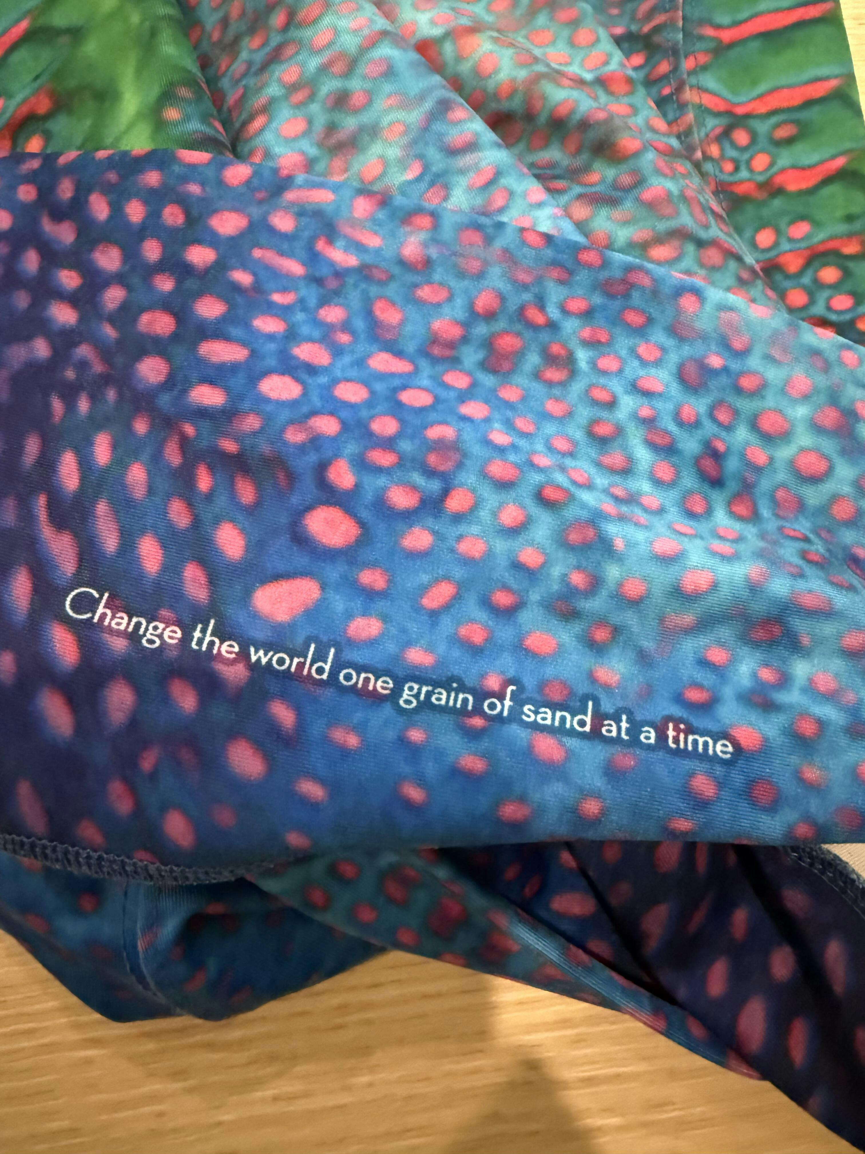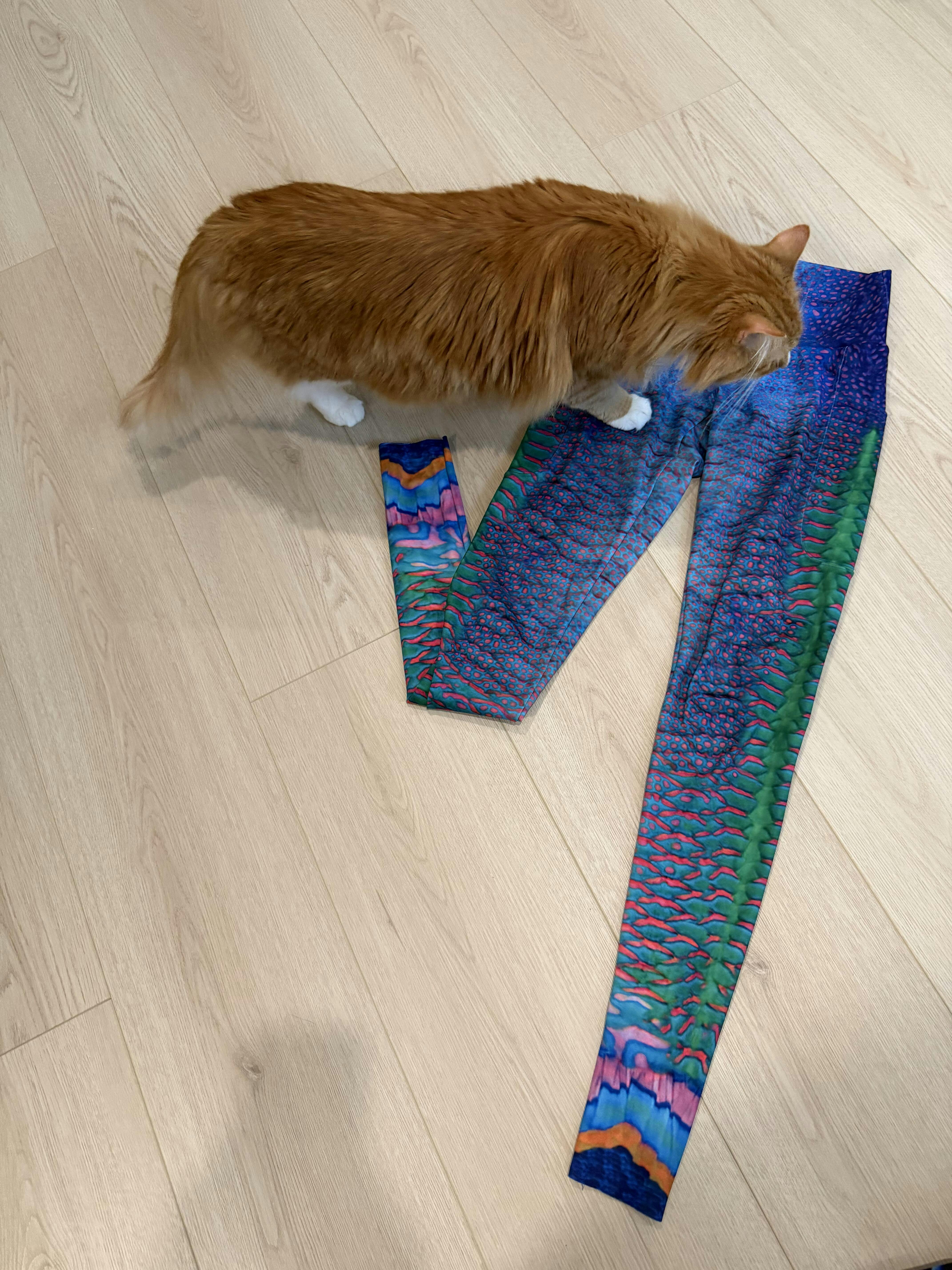 Fun and colorful print! I’ve had these leggings and the matching reversible top for several years now and can vouch Waterlust items really hold up to wearing and washing. Mine are cat-approved (fur can just be quickly brushed off…doesn’t cling to the fabric. Love the pockets and customizable lengths, and the little phrase on the inside of the waistband. I also like that there is no seam on the top edge of the waistband - it’s comfortable for all day wear but I never have any issues with my Waterlust leggings sliding down.