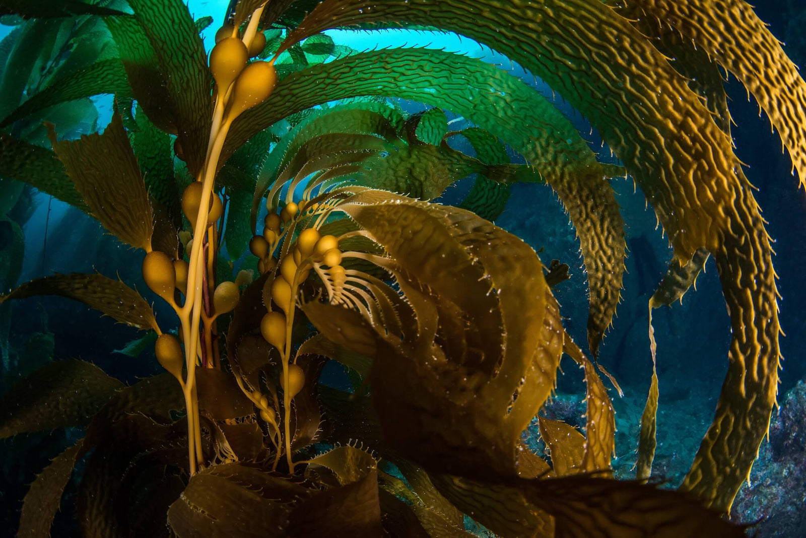Kelps represent the largest species of algae in the world, with some, like the giant kelp, exceeding 100 feet (30 meters) in length. Giant kelp is also one of the fastest-growing organisms in the ocean, growing up to 2 ft per day! Gas-filled bladders beneath the kelp’s blades, called pneumatocysts, float the kelp towards the water’s surface, while the holdfasts keep them anchored in place, creating the iconic forest-like appearance.