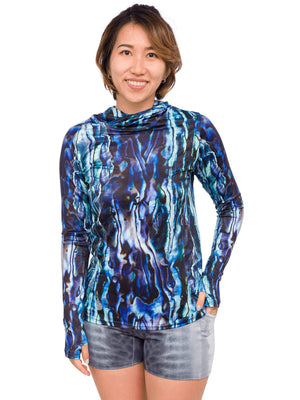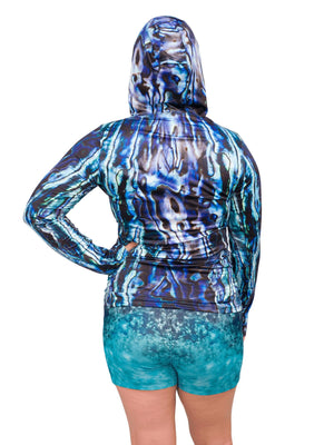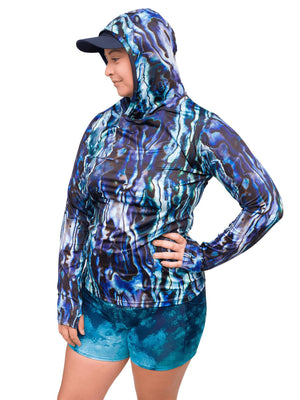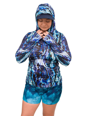 Made from recycled materials and knitted into an ultra fine, lightweight fabric, think of it as the working persons stretchy silk. So silky smooth and cool to the touch, your skin literally gets goosebumps when you put it on, but stays shielded from the sun all day on the water. You can stand in an asphalt parking lot on a hot, humid, sunny day in Miami in July at noon and still feel cool. Yep, our test team tested it…reluctantly.