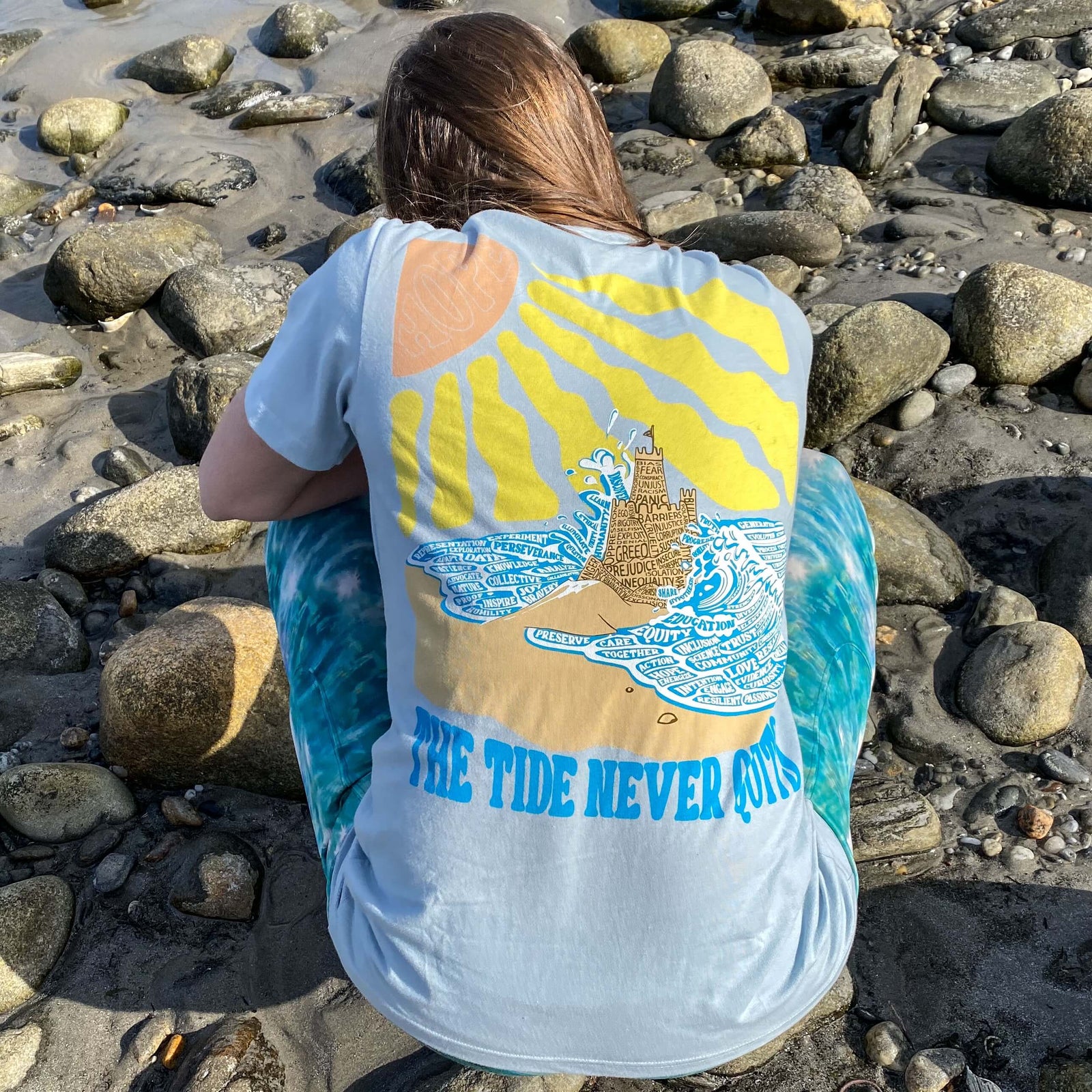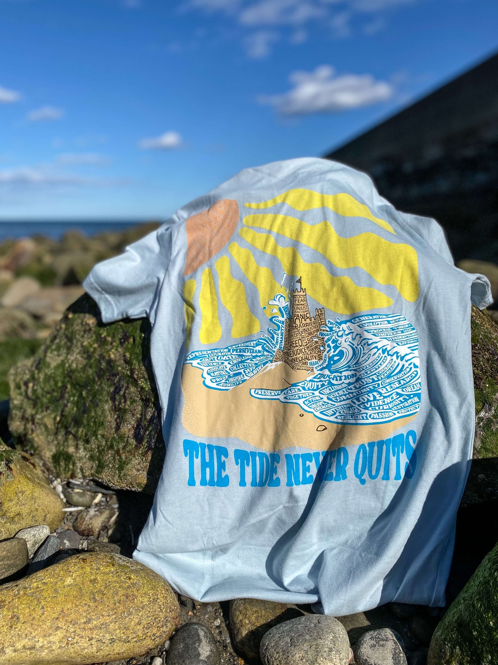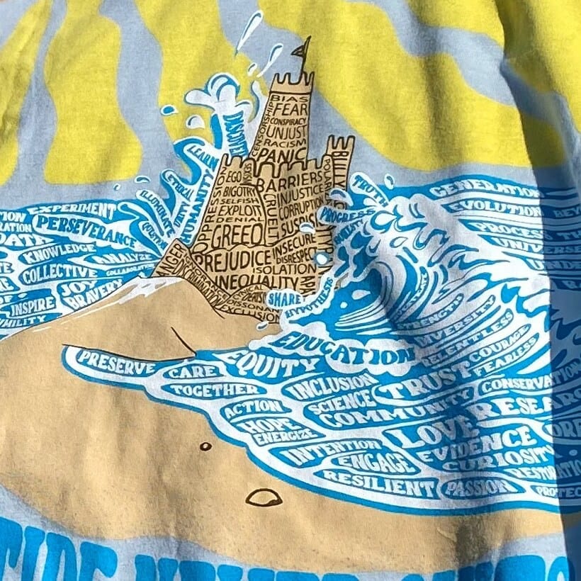 The Tide Never Quits tee is a design meant to remind us that while the ebbs and floods of governance may yank us in different directions, inclusive science always prevails. That’s because science is not an ideology or political flavor of the moment. It’s a process that illuminates facts, and facts guide humanity’s most important decisions. We build bridges with physics. We fight cancer with biology. We power the world with chemistry.