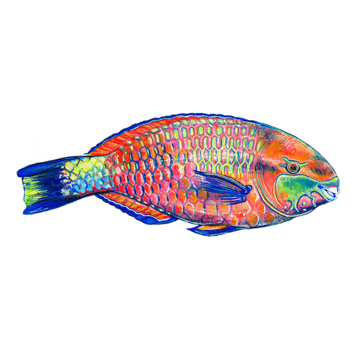 While parrotfish come in many amazing colors and patterns, this print is inspired by a male, terminal phase spotted parrotfish, native to the Indo-Pacific. Considered the most effective reef grazer, parrotfish serve an important function in maintaining the health of coral reefs. In fact, a 2014 IUCN report surveyed the health of Caribbean coral reefs from 1970-2012 and found that one of the most impactful actions we can take to restore the health of coral reef habitat is to protect parrotfish!