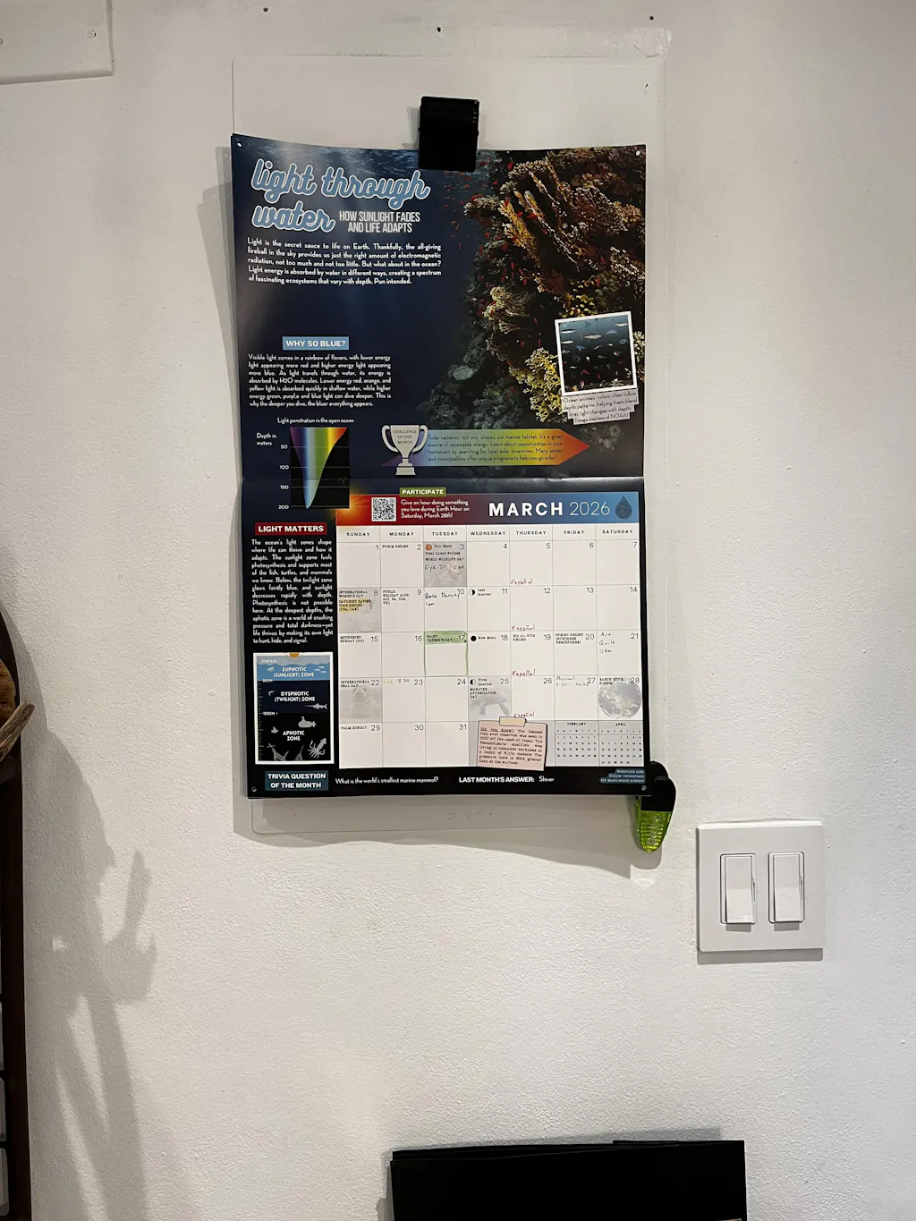 Looks great on our kitchen wall. The first of the month I take it down and read all in interesting facts for the month, write in our monthly appointment, and put it back up to keep us on schedule. Thanks for a great calendar.