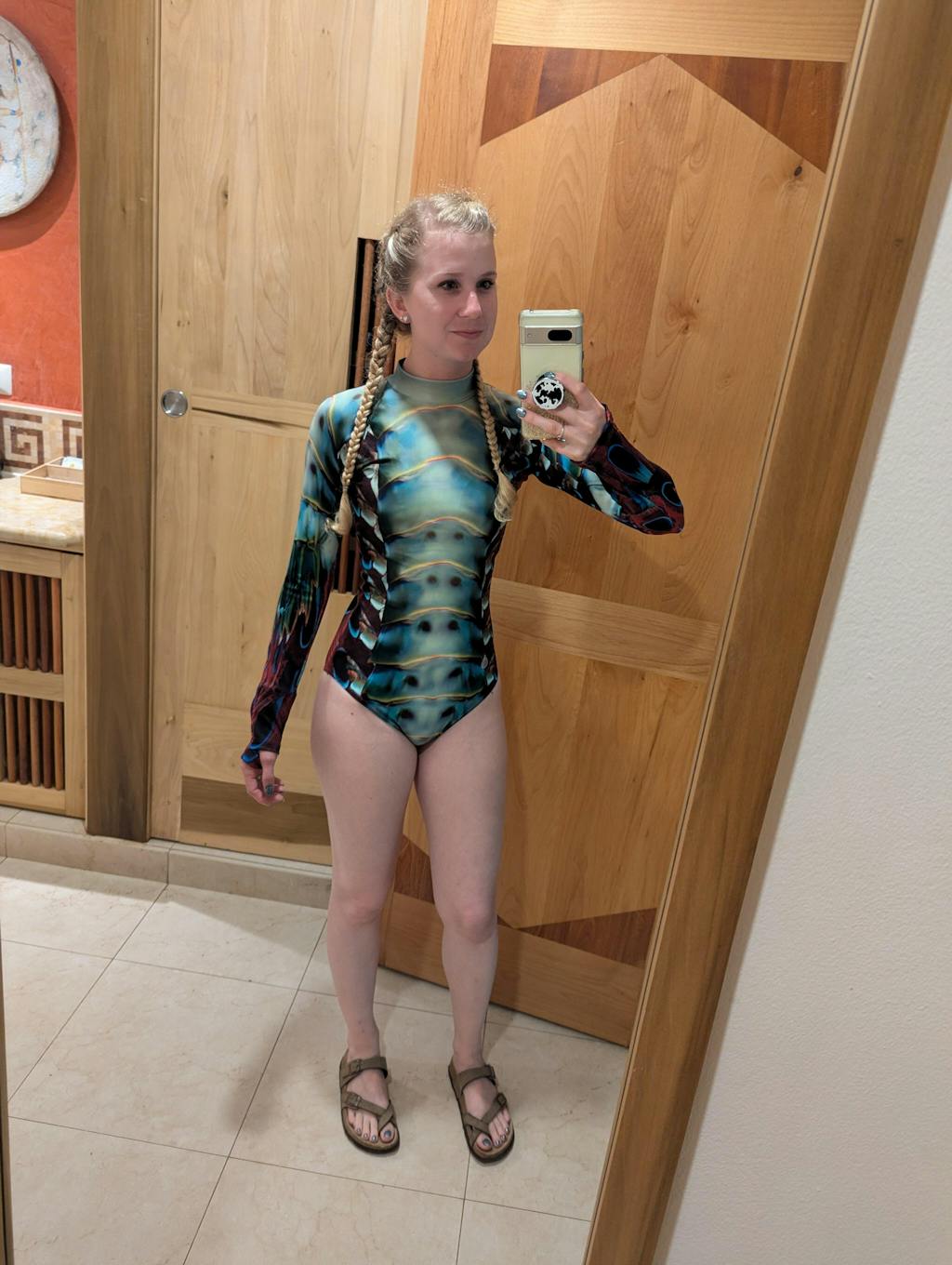 5. High neck collar, thumbholes at wrists, and medium back booty coverage